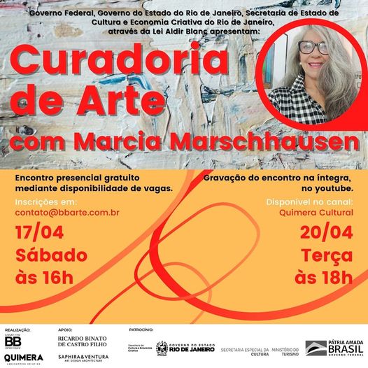 Novo projeto no Espaço BB! O projeto “Curadoria de Arte com Marcia Marschhausen”, é palestra/roda de conversa sobre Curadoria de Arte, tratando da importância desse trabalho a partir da experiência e dos relatos da Curadora do Coletivo BB de Artes Visuais, Arquiteta Marcia Marschhausen.